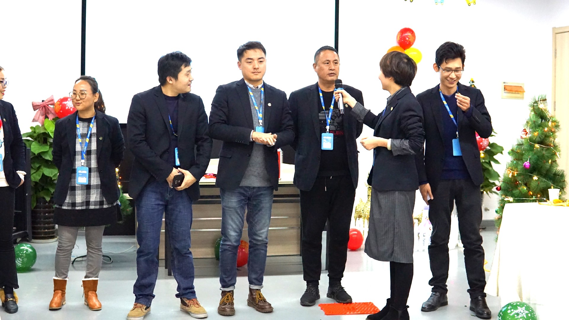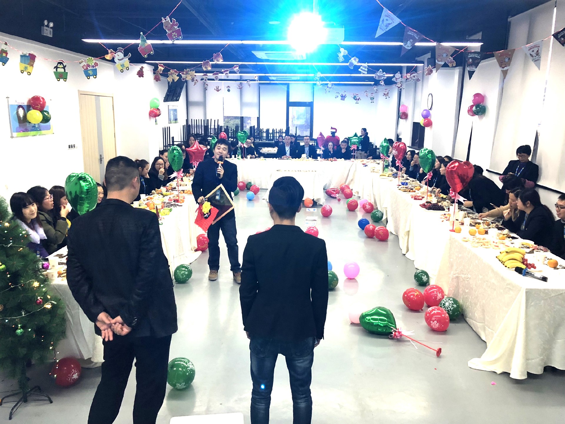 原來是因為這里正在舉辦2018圣誕茶話會,當茶話會遇上生日會,會擦出怎樣的火花?看,副總和總監正在切一個超級大蛋糕分給大家吃,讓我們盡情歡呼吧~~